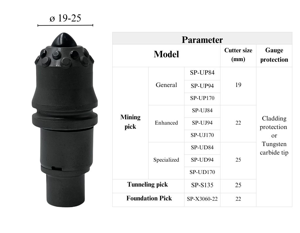 The PDC cutting tip merges the extreme hardness and abrasion resistance of synthetic diamond with the impact toughness of tungsten carbide—delivering reliable cutting efficiency across various formations. The pick body is reinforced with tungsten carbide overlay, while plasma cladding and tungsten carbide gauge protection shield both the holder and the surrounding components from excessive wear and tip undermining.